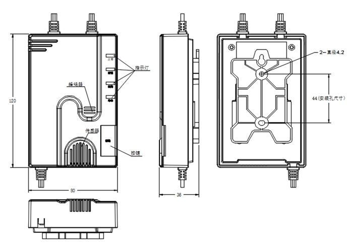 4-2-2使用兩個(gè)Φ6的螺絲將探測器背板固定到墻壁上,然后將探測器固定到背板上(安裝尺寸見(jiàn)外形結構圖)。